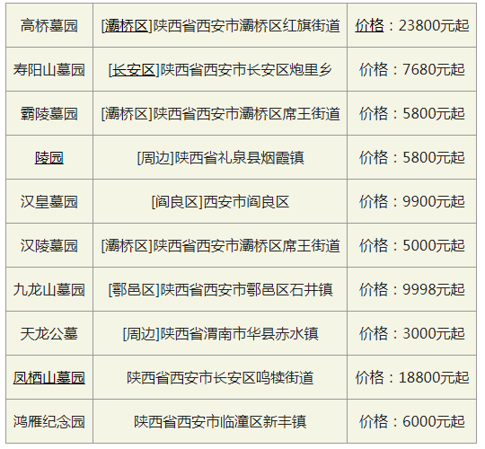 西安公墓一览表价格-西安墓地价格表