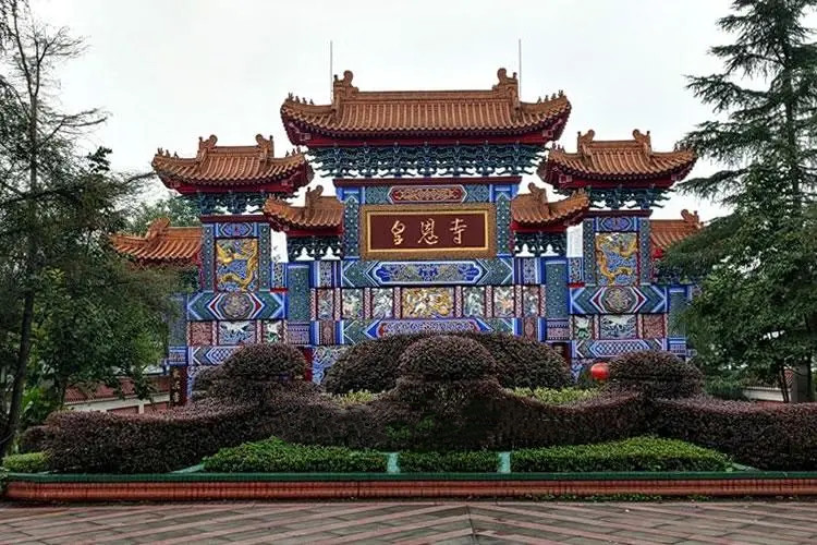 皇恩寺公墓陵园系经四川省民政厅、成都市民政局批准注册,金牛区民政局主管合法社会公共墓地。陵园地处城北天回山,毗邻植物园,四季树木葱郁、鲜花簇拥。陵园扩地建于具有1200年历史包含深厚文化底蕴,从唐至清历朝御赐皇家陵园的皇恩寺遗址。陵园靠山向阳、树木葱笼、视野开阔。居高望远,气若君临天下,势如虎踞龙蟠。尽显浩浩皇恩,泽慧万千子民,乃极佳福祥之地。陵园建设者承吸明清建筑之精髓,融汇现代建筑之技艺,数十种墓穴款式彰出与山水相融,与花木相依,与天地相合之建园思想。神道长廊、天地牌坊、亭台楼阁、雕梁玉砌,依山而上,浑然一体。龟鹤池中数千锦鲤竞相畅游,龙庭泉眼翻滚万千珠玑,尽显山水之生机,天地之灵气。后辈亲朋时至此,凭吊先辈、追念亲友、缅怀故旧,于信步休闲,淡泊宁静中,悟人生之真谛,感亲情之珍贵。仙逝者安息于四季鲜花,绿荫苍翠之龙脉天山,伴岁月之悠悠,纳日月之精华,庇佑生者,赐福在世。诗曰:憩于苍山中,遥望锦官城,城与山相思,山与城相望,相思相望,想望相思,皇恩寺畔,天回山上。