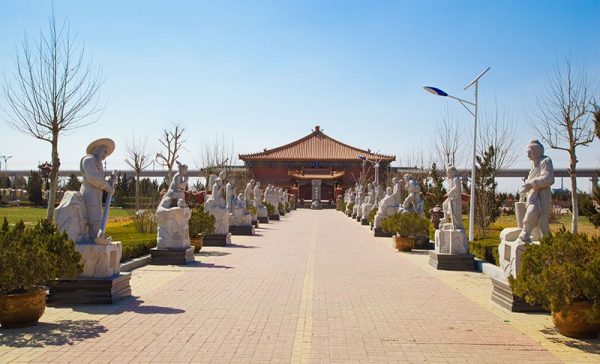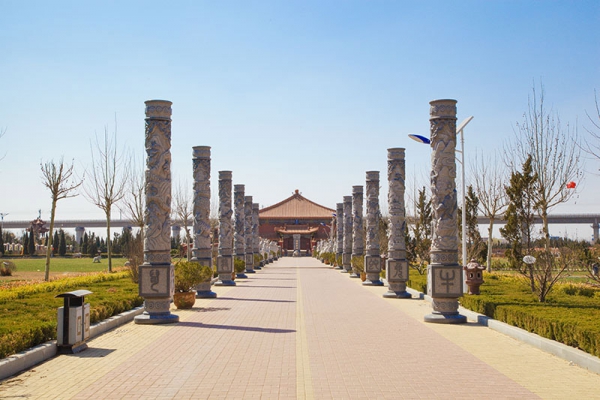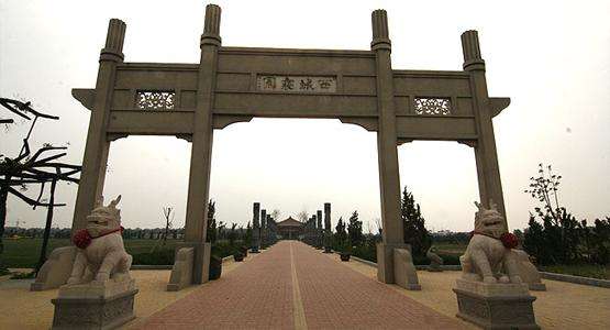 天津西城寝园门前,耸立着具有汉代特色的牌楼,熠熠生辉。园中的金字塔替代了通行的影壁,12生肖跃然其上,栩栩如生,九龙昂首前瞻,吞云吐水,使人一望便可感悟到人生有限、生命无极。寝园分为日松苑、月鹤苑、星延苑、辰年苑四区,梅山池、兰清池、竹水池、菊秀池四湖散布其间。
