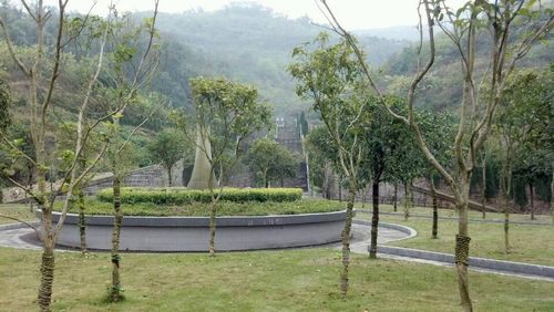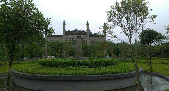 重庆市龙望山公墓正对园区大门沿着栏杆向上走,迎面可见1幢古色古香的中式建筑,建筑背后有神道两侧的24孝雕塑、左边宗山矗立的一座观音和地藏王菩萨相互呼应,映衬着天人合一、生命轮回的庄重与肃穆,将佛、儒、道三教文化完美融合;把传统的孝道文化之善与现代的人文艺术之美高度统一,诉说着中华民族千百年的传统文明。园区整体规划秉承了皇家园林陵寝的秀致、庄严、龙脉连绵的磅礴气势,荟萃了具有古典品质的东方造园艺术,又融合了世界墓葬主流文化,完美地实现了创造者将凤凰山人文纪念园建成瞻仰性、纪念性、知识性的总体构想。