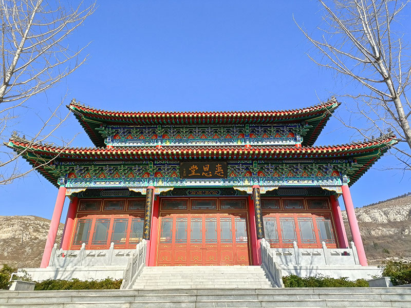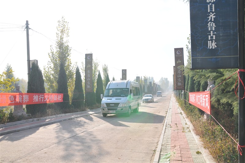 桃花山陵园园区沿东向西展开,坐北朝南。她异于别处的独特地脉来自于门前烟波浩渺,氤氲如玉带的微山湖,演绎着“水主财富”的民俗理念;也来自于她得天独厚的山势:形如凤凰展翼,又像太师宝椅,藏风聚水兼得,人丁财富尽握,符合“东成西就、北座南向”的传统选陵标准,是一个地灵足千秋,富贵发万代的风水宝地。