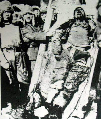 之后又找到县城最有名望的蔡木匠和贾木匠,一夜之间雕刻好了杨靖宇的头颅,并用榆木做了一个八尺长、一尺多宽的碑,请县里写毛笔字最好的李咸阳老先生执笔,正面大字楷书“杨靖宇之墓”,背面署名“岸古隆一郎”,边款小字为“康德七年三月五日立”。伪街公所准备了上等寿材,又请来一位日本僧人。这一切准备工作就绪后,伪通化省警务厅长岸古隆一郎被杨靖宇不屈的意志深深地震撼到了,整日都活在杨靖宇将军亡魂的噩梦之中,精神几近崩溃。